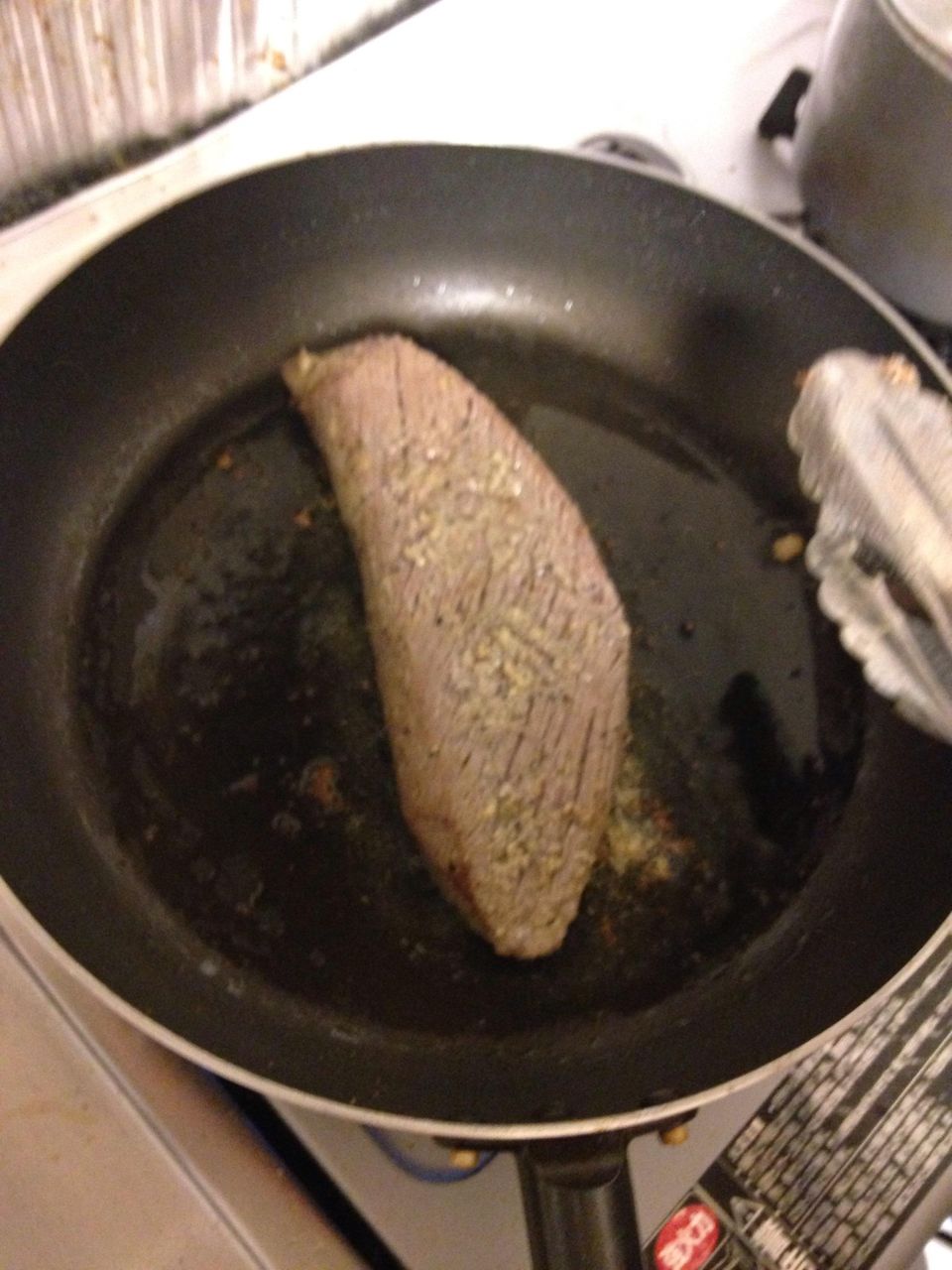 表面にしっかり焼き色つけた後、アルミホイルで包んで保温して中に火を通すから、赤い色でも火は通るんだよ!