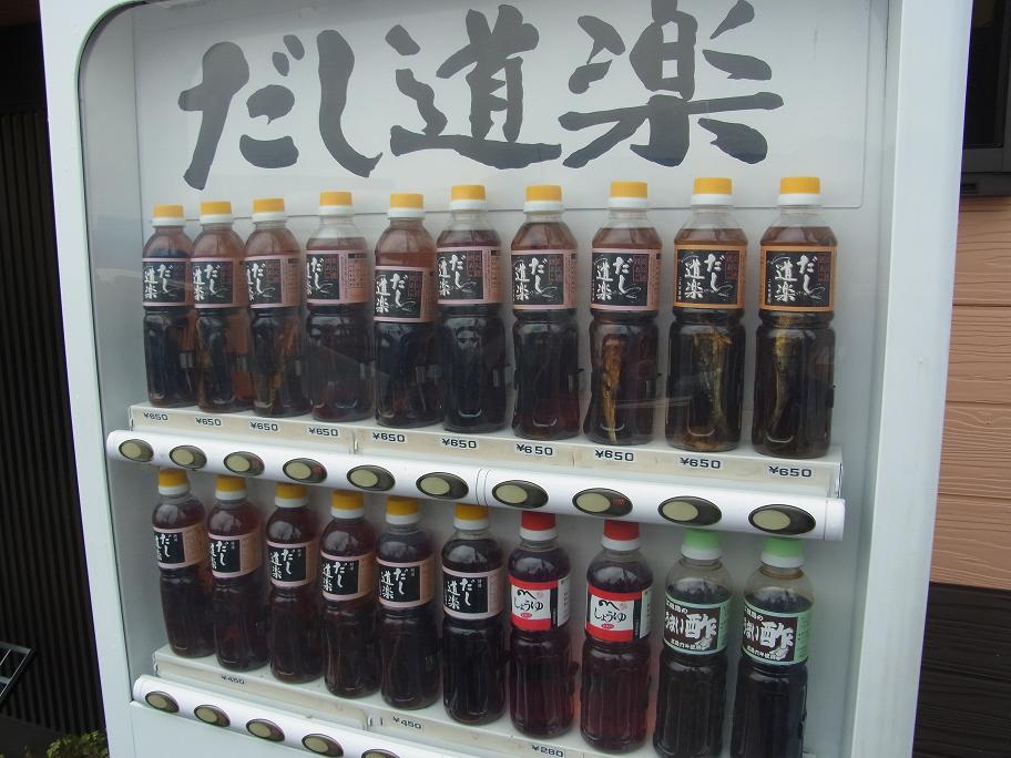 白い自販機に、一見、ウーロン茶のようなペットボトルが並んでいます。すべて「だし」です。商品名は「だし道楽」。