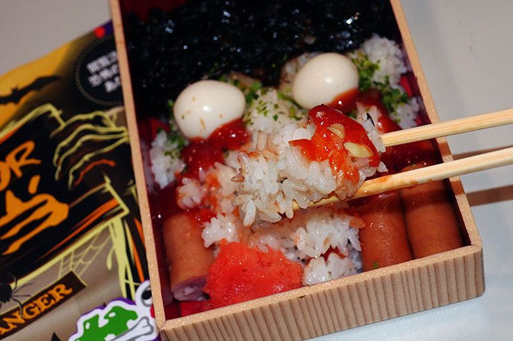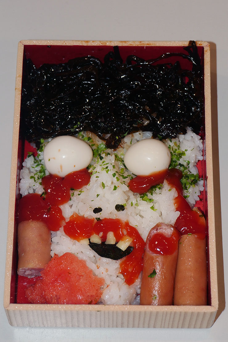 炎で焼かれたような髪の毛を昆布で作り、血液をケチャップで表現し、牙をチーズでデザインしている。眼球はうずらの卵を使っているため、白目である。ちなみに、弁当によって「ホラーの度合い」が違うらしい。手作りなので、怖さにムラができるのだろう。