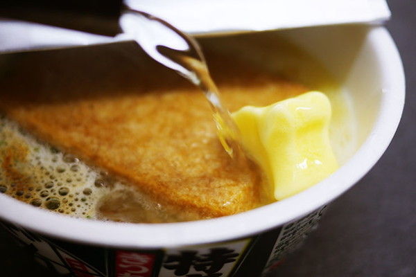 な?」と思うくらい入れます。そうすることで、どん兵衛のコクと「のどごし」が増幅されるだけでなく、麺から溢れる旨味成分とバターの