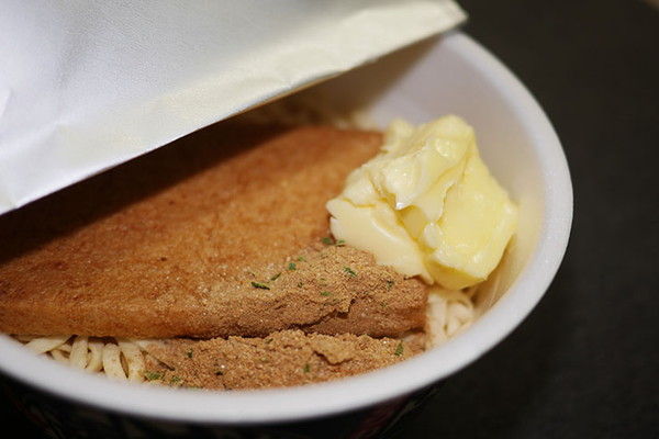 どん兵衛を革命的に美味しく食べる方法、それは「バターを入れて食べる」です。バターは必ず有塩バターを使用し、「ちょっと入れ過ぎか